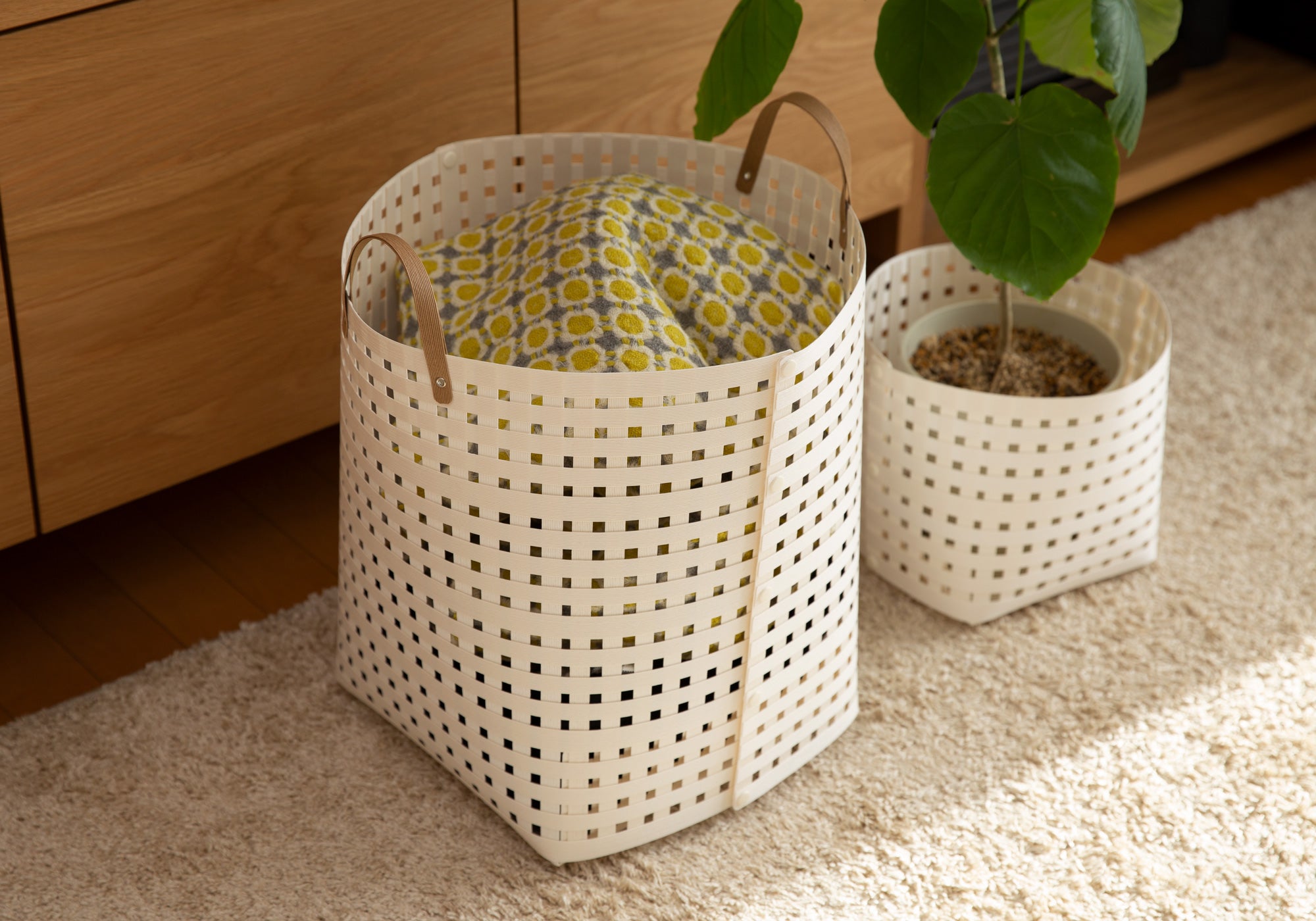 リビング、ダイニング、ベッドルーム、クローゼット、オフィスなど置く場所を選びません。幅広いシーンでの収納に活躍するだけでなく、観葉植物の鉢カバーとしても使えます。