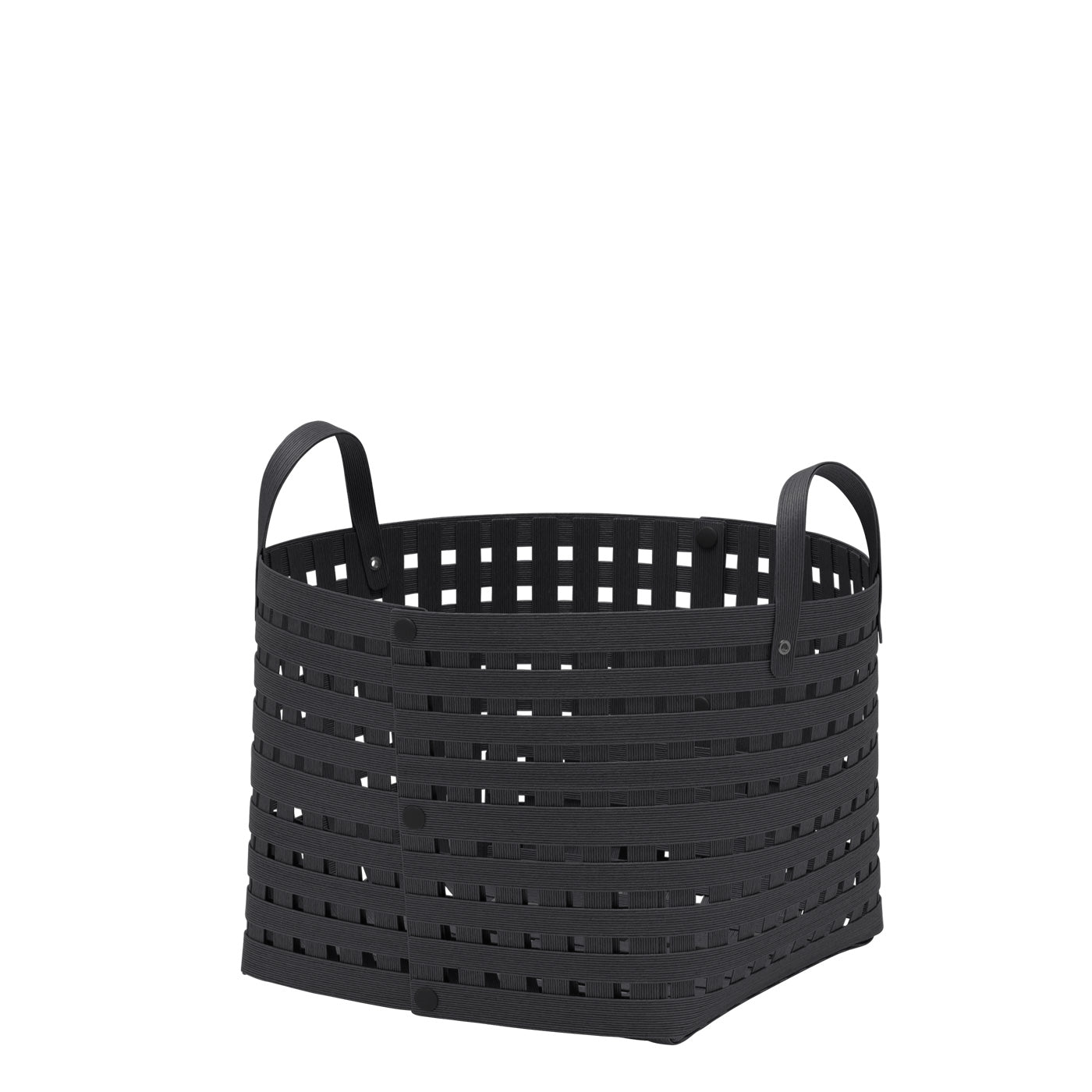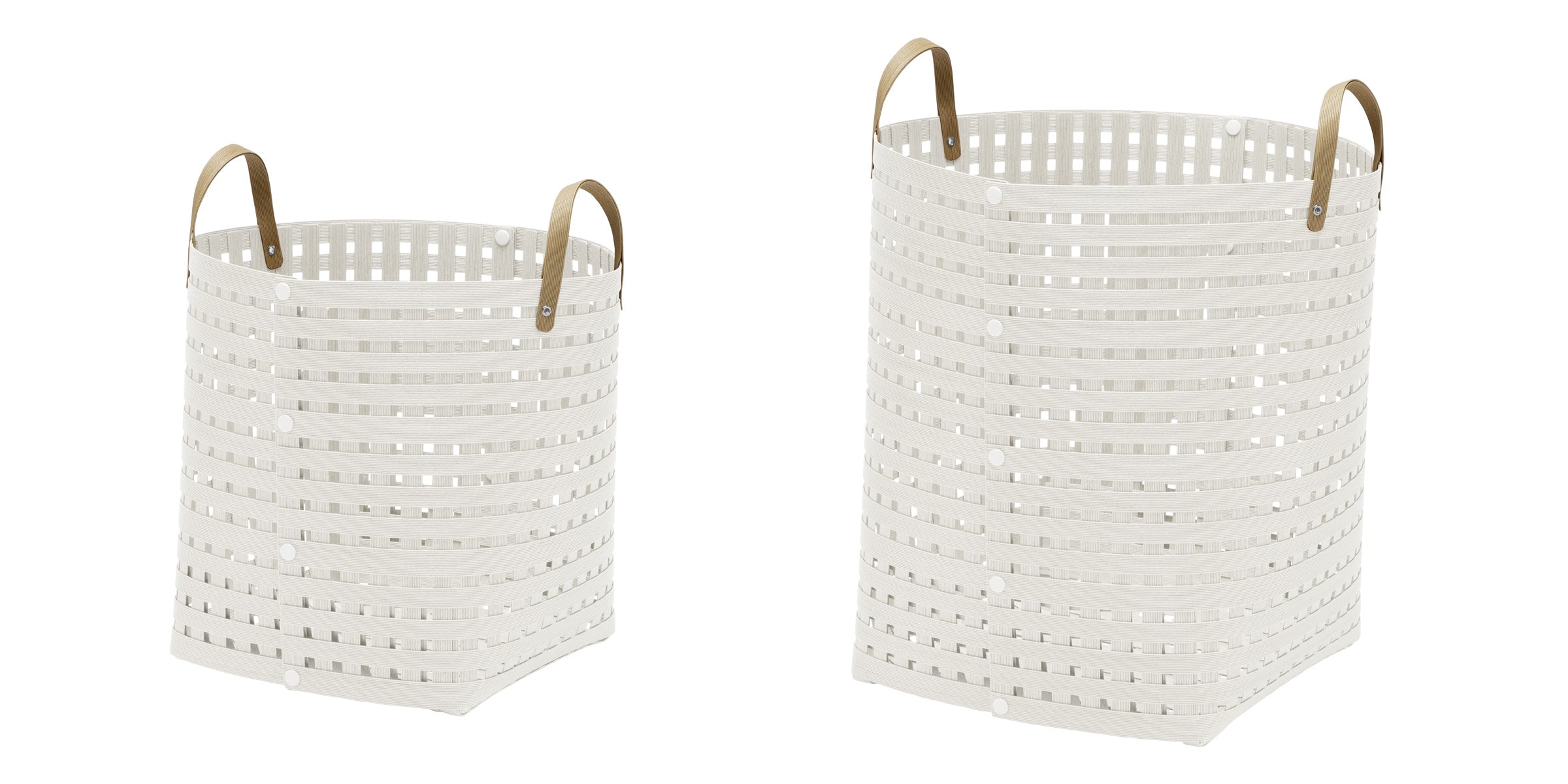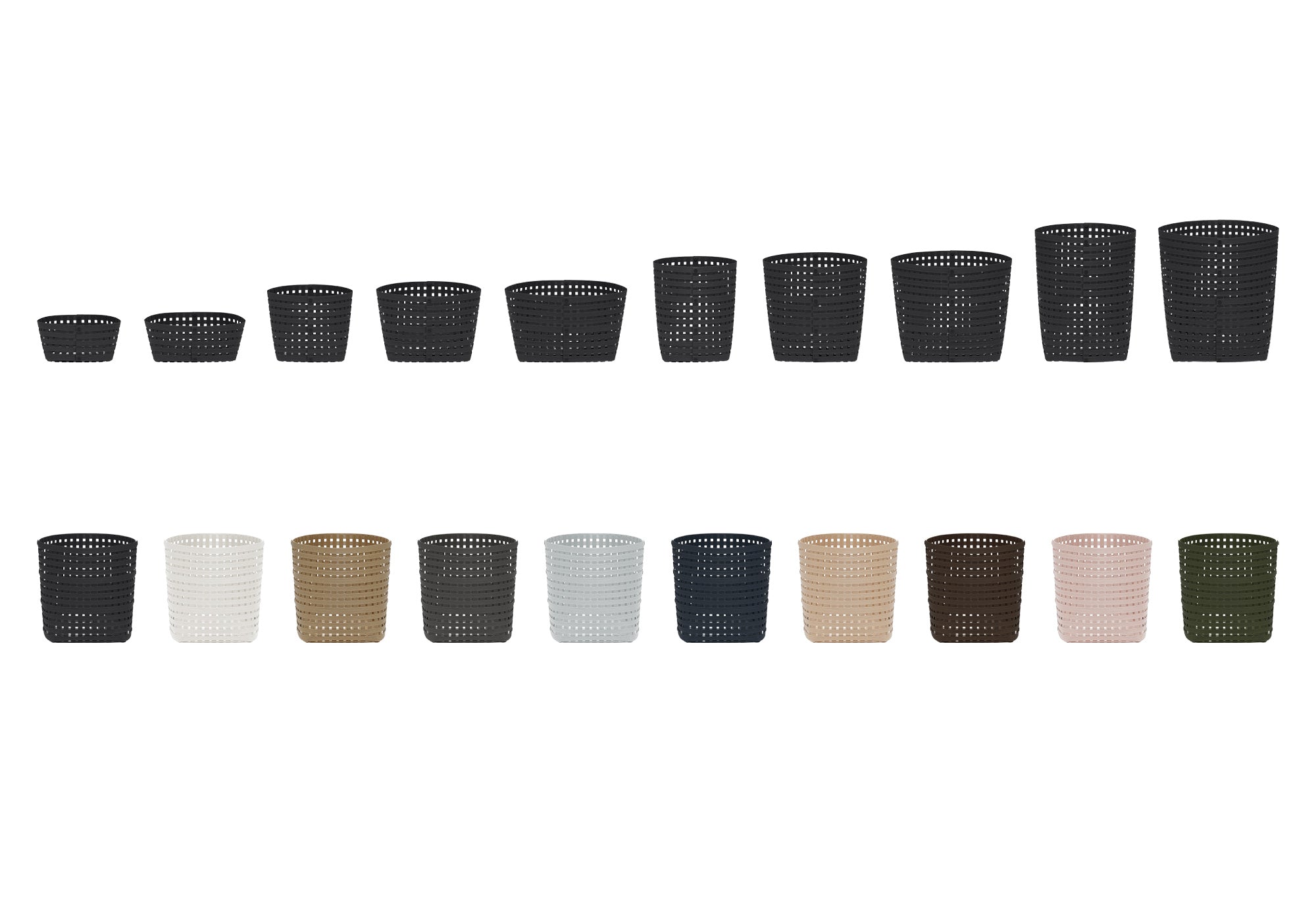 バンドシー バスケットは、10種類のサイズのバリエーションがあります。S M L の3つのサイズと4種類の高さがあり、小物入れから収納力の高いものまで対応。ハンドルなし(10種類)ハンドル付き(8種類)の合計18種類のモデルから選べます。