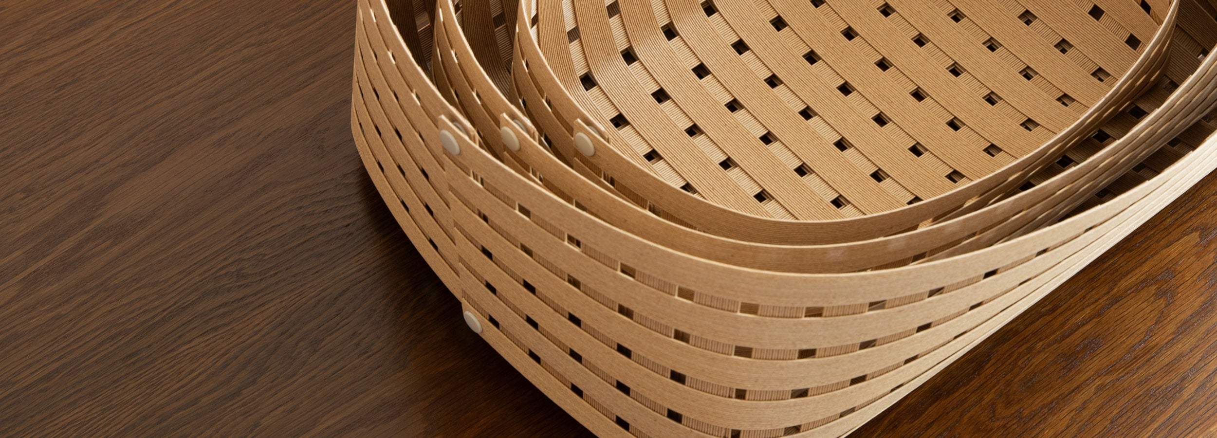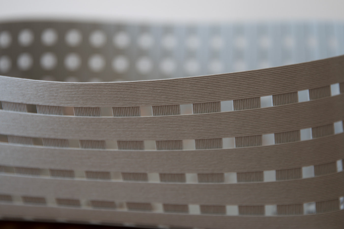 "和紙のバンドに美しさを感じ、この素材をインテリアに活用できないかとの考えに基づき、素材の研究、編まずして強度を得るための実証が徹底して行われている。用いられた「より紙」は日本の暮らしと密接な米袋の持ち手に使われてきたものだという点も興味深い。現代の技術を用いた型の作成や精度の検証と、丹念な手仕事の双方が適切に活かされている。使用しないときには平面にできるという機能的な構造になっている。